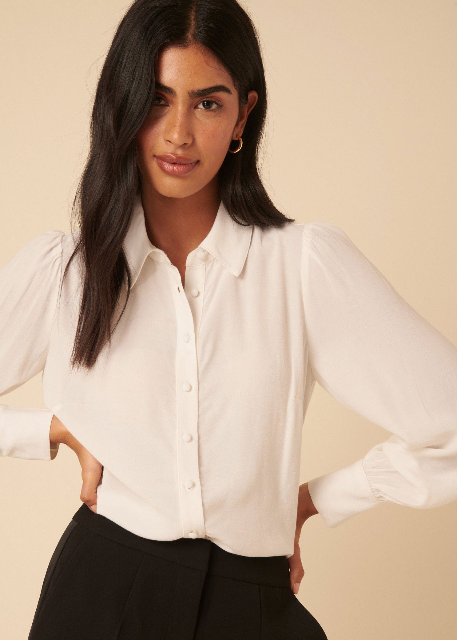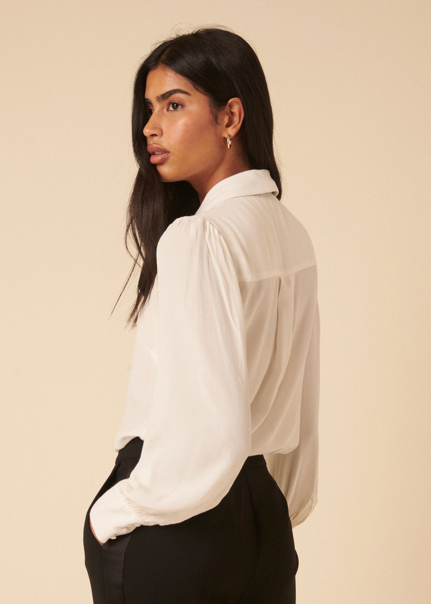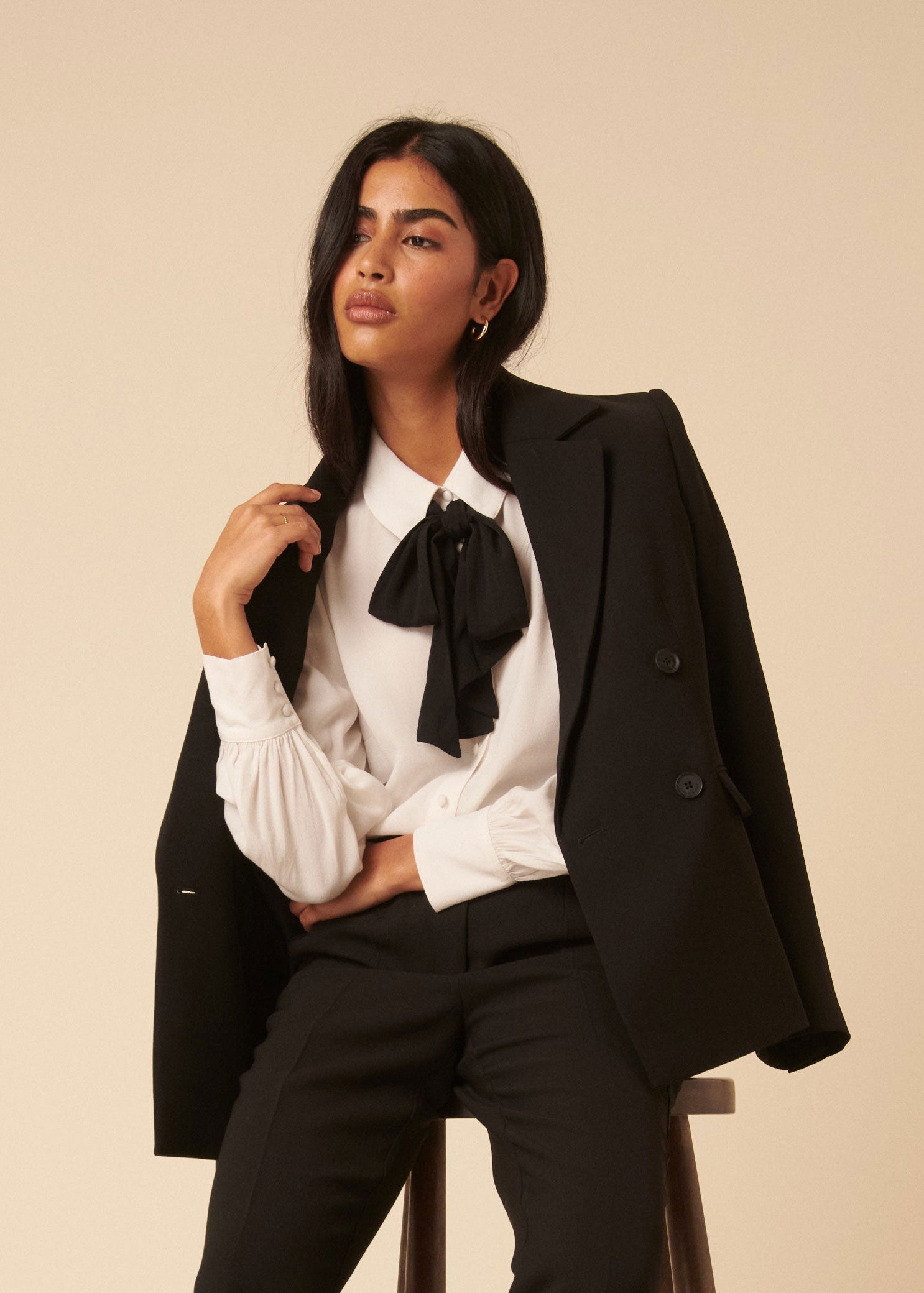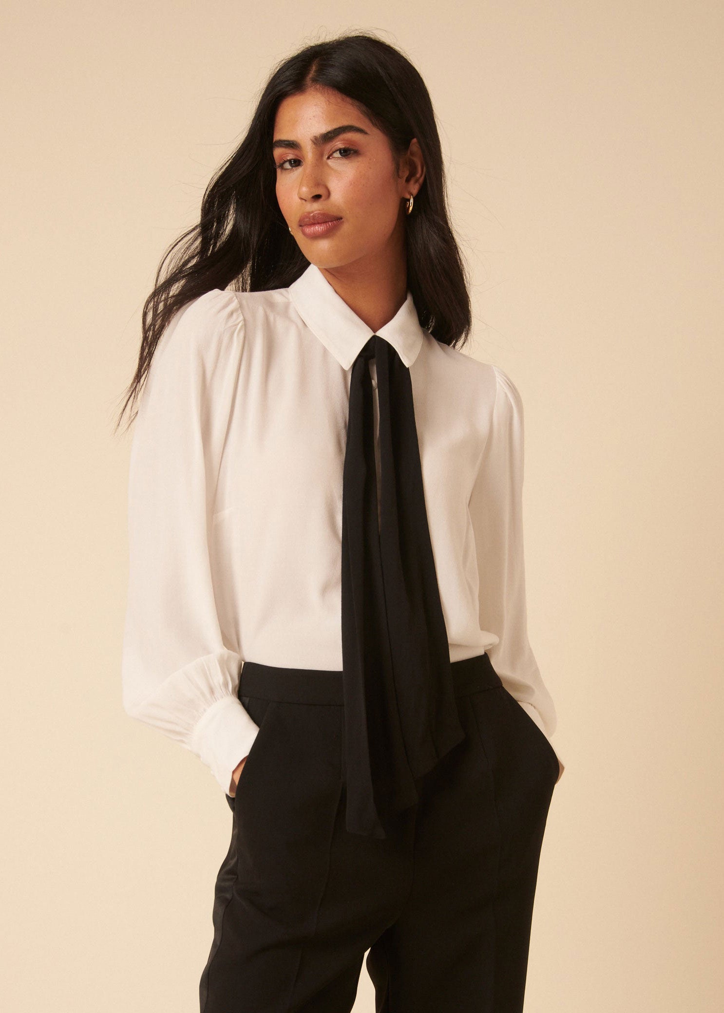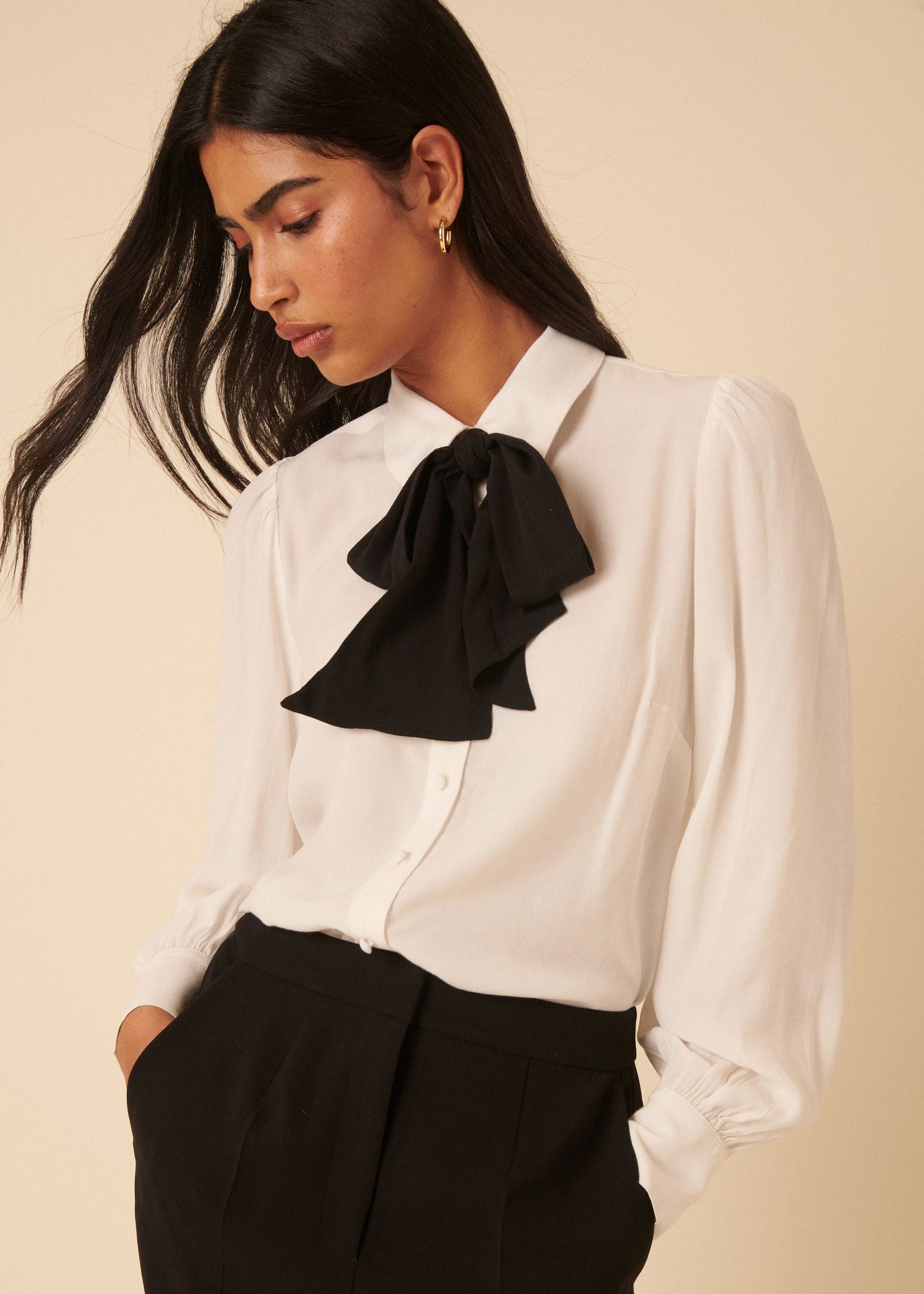 This white blouse features a classic collar, long sleeves, and button front. Cut to a relaxed fit, it's finished with a detachable black satin bow.
