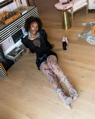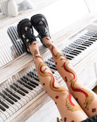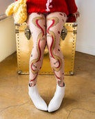 Our bestselling Year of the Dragon sheer sock is now available as tights! Featuring two dragons on the front and back of each leg accented with red and black flowers, our sheer dragon tights are the ultimate statement accessory. Set against soft sheer fabric, these patterned tights are unlike anything on the market. Pair with shorts and boots for an edgy look, or dress it up with a skirt and heels.